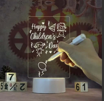 Giv din kreativitet lys med vores innovative tegne-lampe! Skriv, tegn eller efterlad søde beskeder på den gennemsigtige akrylplade, som oplyses smukt af den varme LED-base. Perfekt som natlampe, dekoration eller en personlig gave. Skriv med den medfølgende pen, og visk let ud for at skabe nye designs igen og igen.